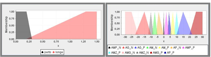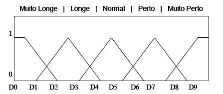 Em um sistema de controle fuzzy, possuímos variáveis de entrada que representam os valores que podem ser obtidos através de sensores. Tais valores podem ser categorizados em faixas: muito longe, longe, normal, perto, muito perto. Esses estados são conhecidos como estados fuzzy e não possuem um limiar definido de um para outro. As variáveis de entrada podem pertencer a vários estados com diferentes níveis de pertinência. A Figura 2 apresenta um exemplo de funções de pertinência de uma variável fuzzy.