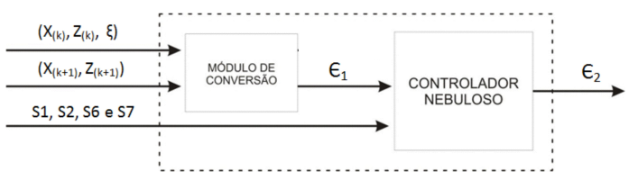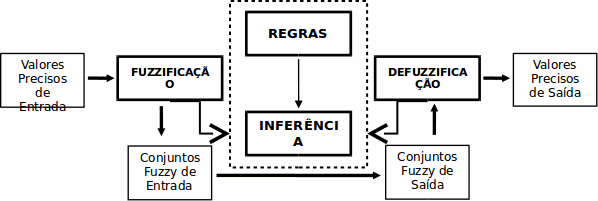Os valores de entrada, conhecidos como crisp, são convertidos para valores fuzzy em um processo conhecido como “fuzzificação”, utilizando as funções de pertinência dos termos fuzzy de entrada. O grau de participação de uma grandeza de entrada é dado em função dos termos primários definidos como o “Universo do Discurso” de entrada. Assim, cada valor de entrada tem um grau de pertinência para cada termo primário definido. A arquitetura fuzzy pode ser observada na Figura 3.