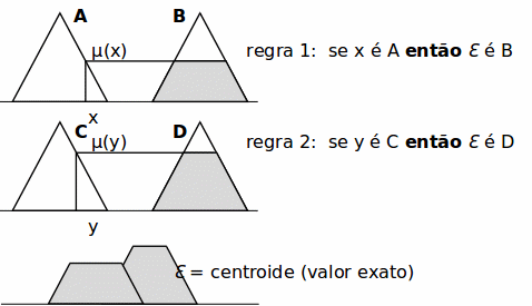 Os valores obtidos por todas as regras de inferência que foram acionadas são “defuzzificados” para valores exatos por meio de um dentre vários métodos possíveis. Por exemplo, o método do centróide retorna o centro de massa do resultado como valor exato. Por sua vez, o método da altura retorna o maior valor. A Figura 4 apresenta um exemplo de um sistema de inferência nebuloso que utiliza o método do centróide para realizar a defuzzificação.