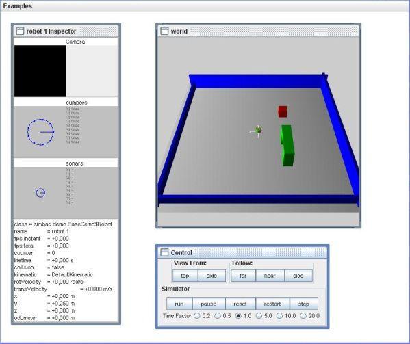 O Simbad possui uma interface que permite a manipulação e a visualização dos eventos da simulação. Durante a execução do programa, aparecerá uma janela dividida em três setores, como mostra a Figura 5. A janela World exibe o mundo da simulação descrito pelo usuário ou algum dos exemplos presentes no Simbad. Na parte lateral situada à esquerda são exibidas as informações do robô e de seus acessórios, como o nome do robô, alcance dos sensores, velocidade translacional e rotacional, visão da câmera, colisão, tempo de vida do robô, entre outras, que podem variar de acordo com o projeto. A terceira janela é a Control, esta é dividida em três abas. As abas View From e a Follow são responsáveis pela visualização da simulação. A aba Simulator permite rodar, pausar, reiniciar ou passar cada etapa da simulação manualmente, além de alterar a velocidade da simulação na opção Time Factor.