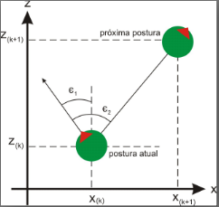 A postura do robô é determinada pela sua orientação no ambiente (x, z, ξ), na qual x e z representam suas coordenadas no plano bi-dimensional e o ângulo ξ representa a direção do seu movimento. Durante a navegação, a postura atual, a próxima postura e o ângulo atual são utilizados para calcular o ângulo de rotação necessário para o robô alcançar o objetivo, como ilustrado na Figura 6. Os sonares frontais indicam a distância dos obstáculos que possam existir no caminho. O controlador nebuloso utiliza as informações sobre a diferença angular das posturas e da distância dos obstáculos para definir o ângulo de rotação. A velocidade de translação do robô é mantida fixa para simplificar a modelagem.