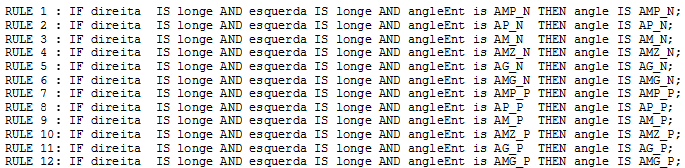 As regras de inferência são colocadas no arquivo navigation.fcl, tendo um objetivo com duas premissas: fazer o robô desviar dos obstáculos, se os mesmos estiverem próximos, ou fazer simplesmente o robô continuar a sua trajetória quando o caminho está livre. A Figura 8 apresenta algumas das regras utilizadas. O sistema utilizado foi o método dos mínimos de Mamdani. No processo de defuzzificação, os valores obtidos pelas regras acionadas foram defuzzificados através do método de máximo mais à esquerda.