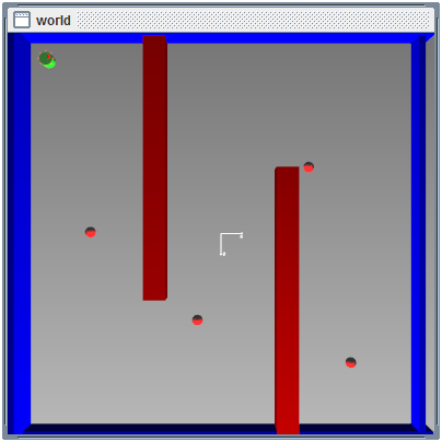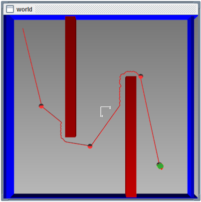 A avaliação do sistema proposto utiliza dois ambientes de simulação. Nos quais foram criados obstáculos no intuito de bloquear a trajetória do robô através das coordenadas inseridas, representadas pelas esferas vermelhas no cenário, testando assim, a lógica nebulosa para desvio de obstáculos. Para o primeiro ambiente, foi modelado um cenário simples, com dois obstáculos do tipo parede, o qual é ilustrado na Figura 9. Através da utilização da lógica fuzzy, a navegação do robô foi realizada com êxito. A Figura 9 demonstra também como o robô consegue seguir as coordenadas estipuladas e, ao mesmo tempo, desviar dos obstáculos dispostos no ambiente.